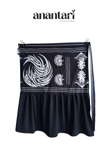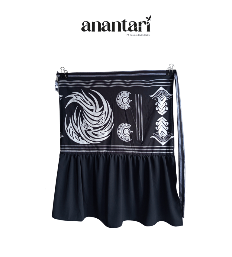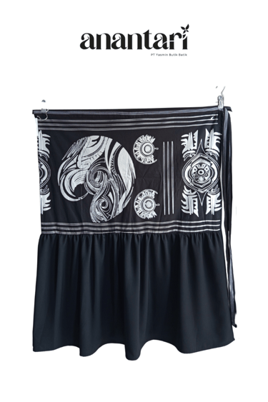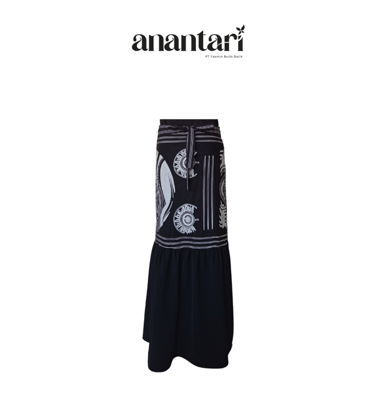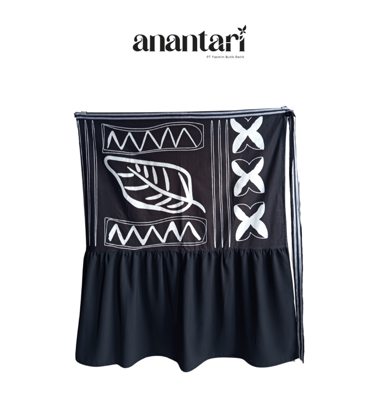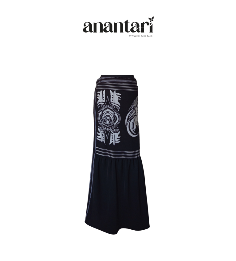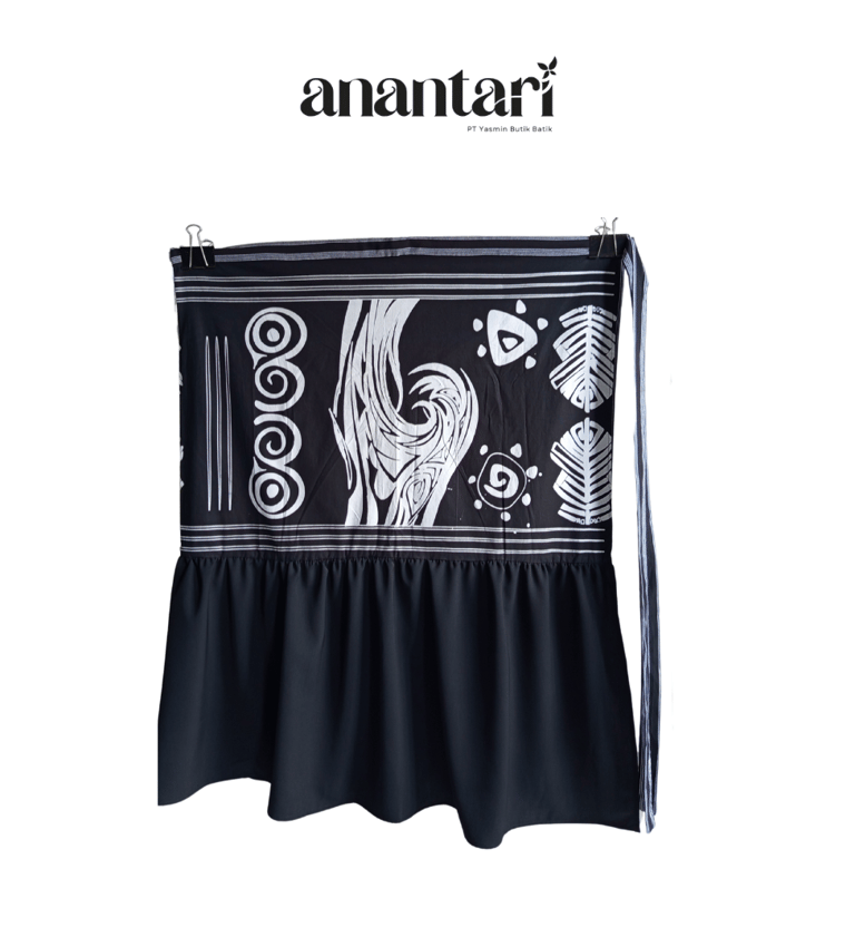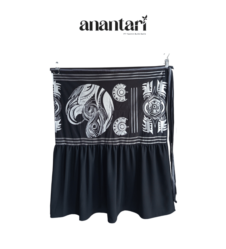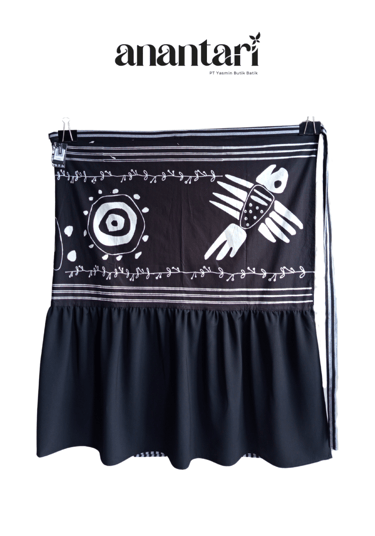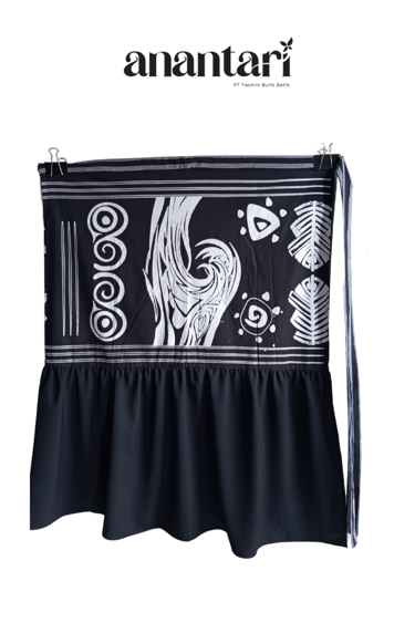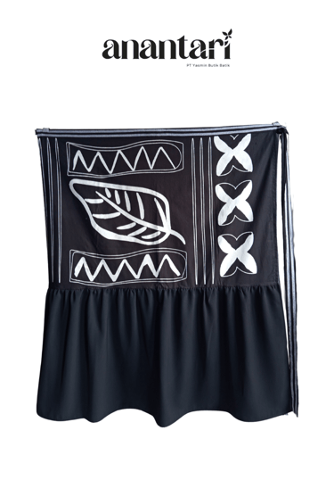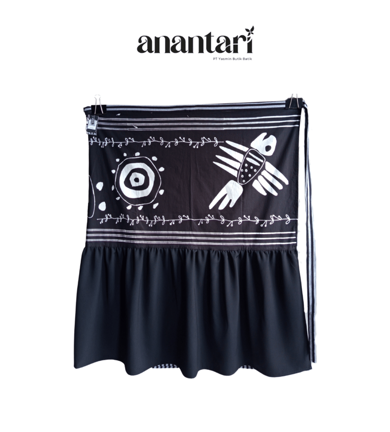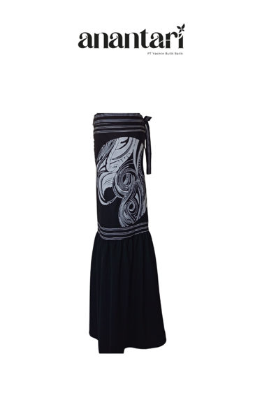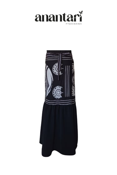 Atiira Saroong is a wrap skirt featuring a subtle pleat detail at the hem to elevate its aesthetic appeal. This Saroong features hand-drawn batik material, complemented by lurik weaving and black jet fabric. It is elegantly draped and includes a long strap that can serve as a tie for a wrap skirt, resulting in a sophisticated, simple, and classy appearance when worn.