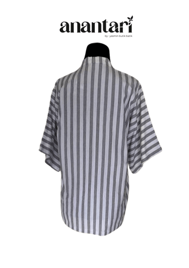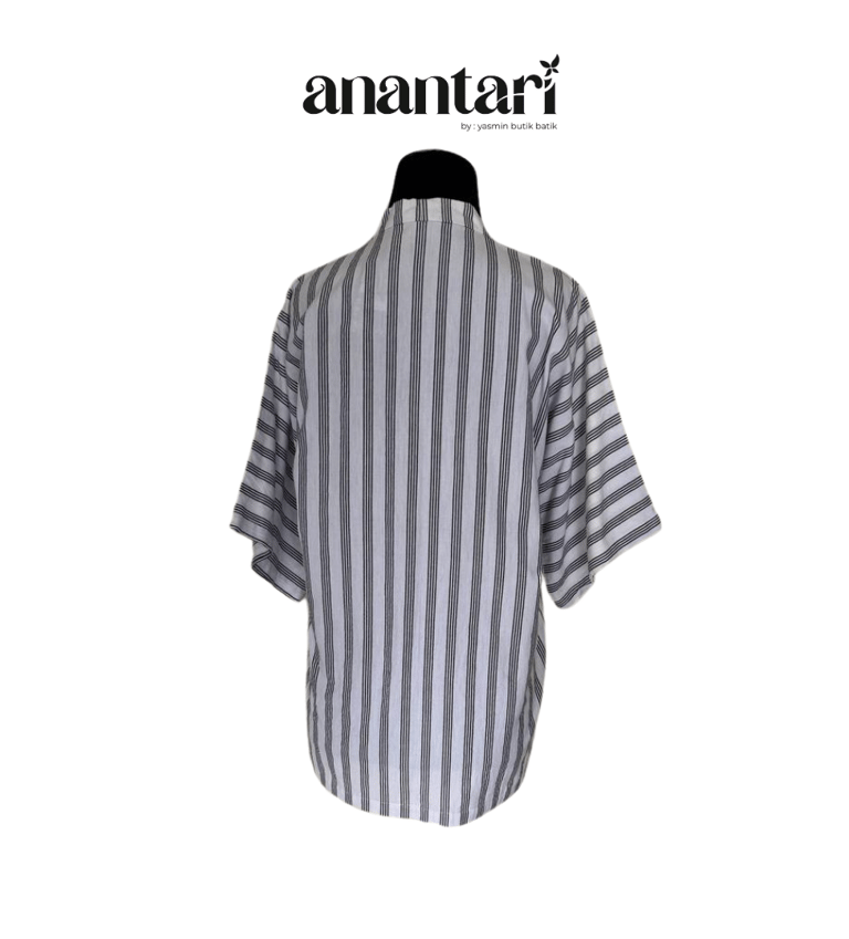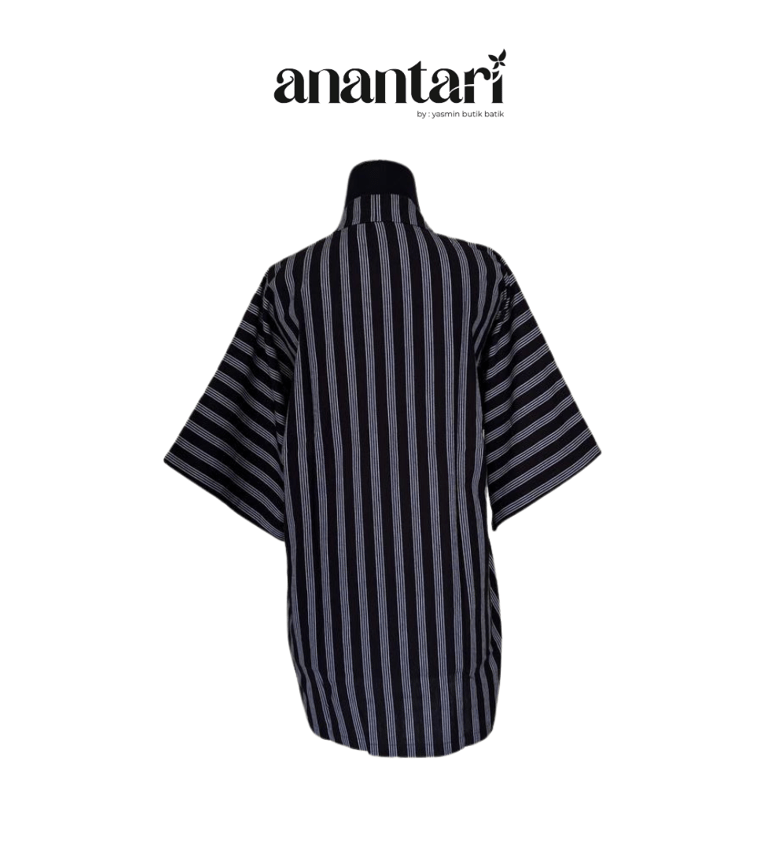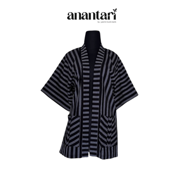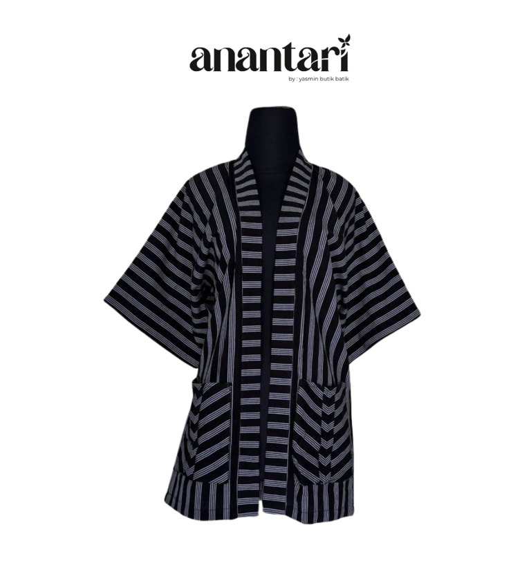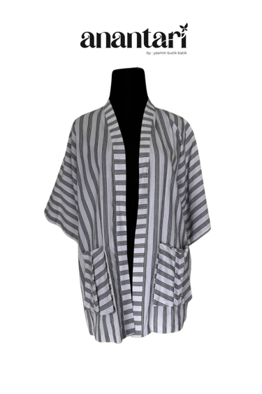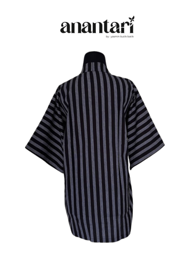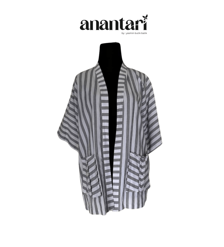 The Kimono Outer Tenun Lurik is a kimono-style outerwear crafted from Tenun Lurik. This outer garment features a pocket measuring 15x17 cm, suitable for storing a cellphone. The Outer Kimono is offered in two color variants: black and white. The straightforward and adaptable model is highly appropriate for application in both formal and semi formal environments